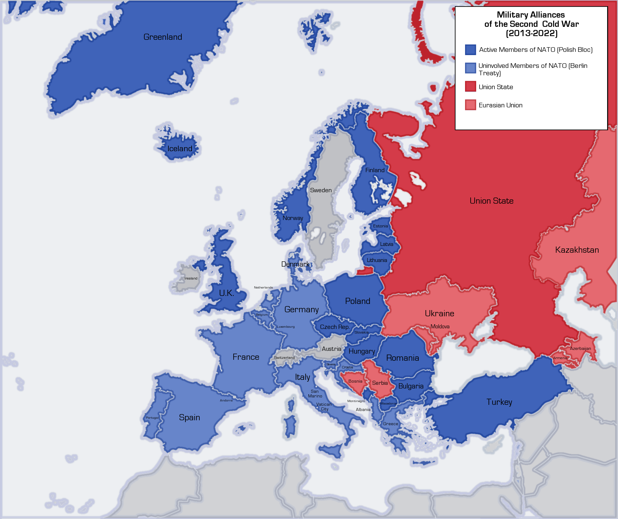 Cold War II also known as the Second Cold War (approx. 2013–2022) was a continuing state of political and military tension between the powers of the Western world, led by the United States and its allies, and the Union State with its satellite states and allies. Unlike the First Cold War, this conflict was largely over regional security issues, rather than an overarching economic and ideological conflict. The Union State created the Eurasian Union with the Central Asian and Caucasian countries it occupied, maintaining these as satellite states.