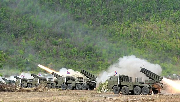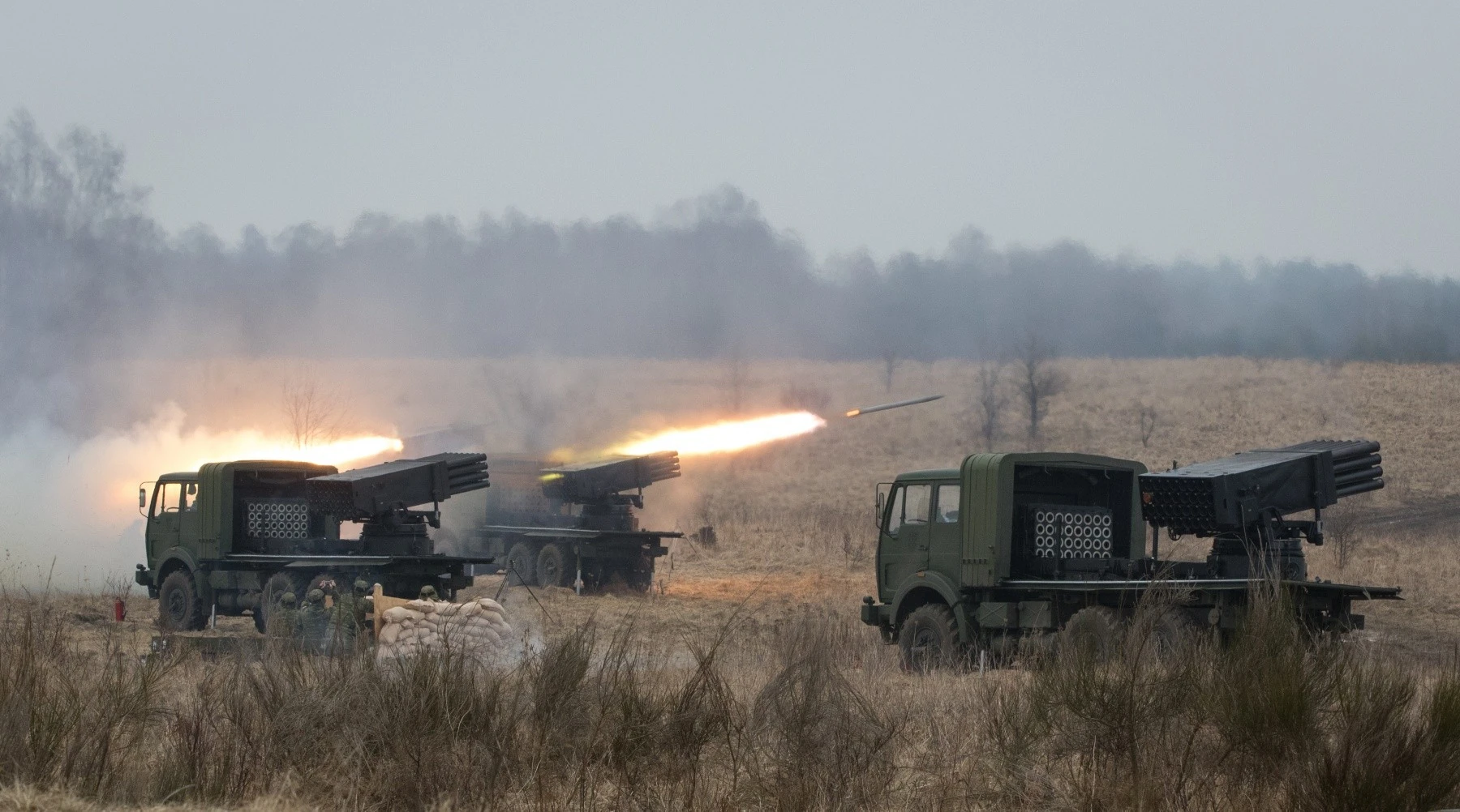 Russian BM-30 Smerch firing rockets with incendiary munitions.