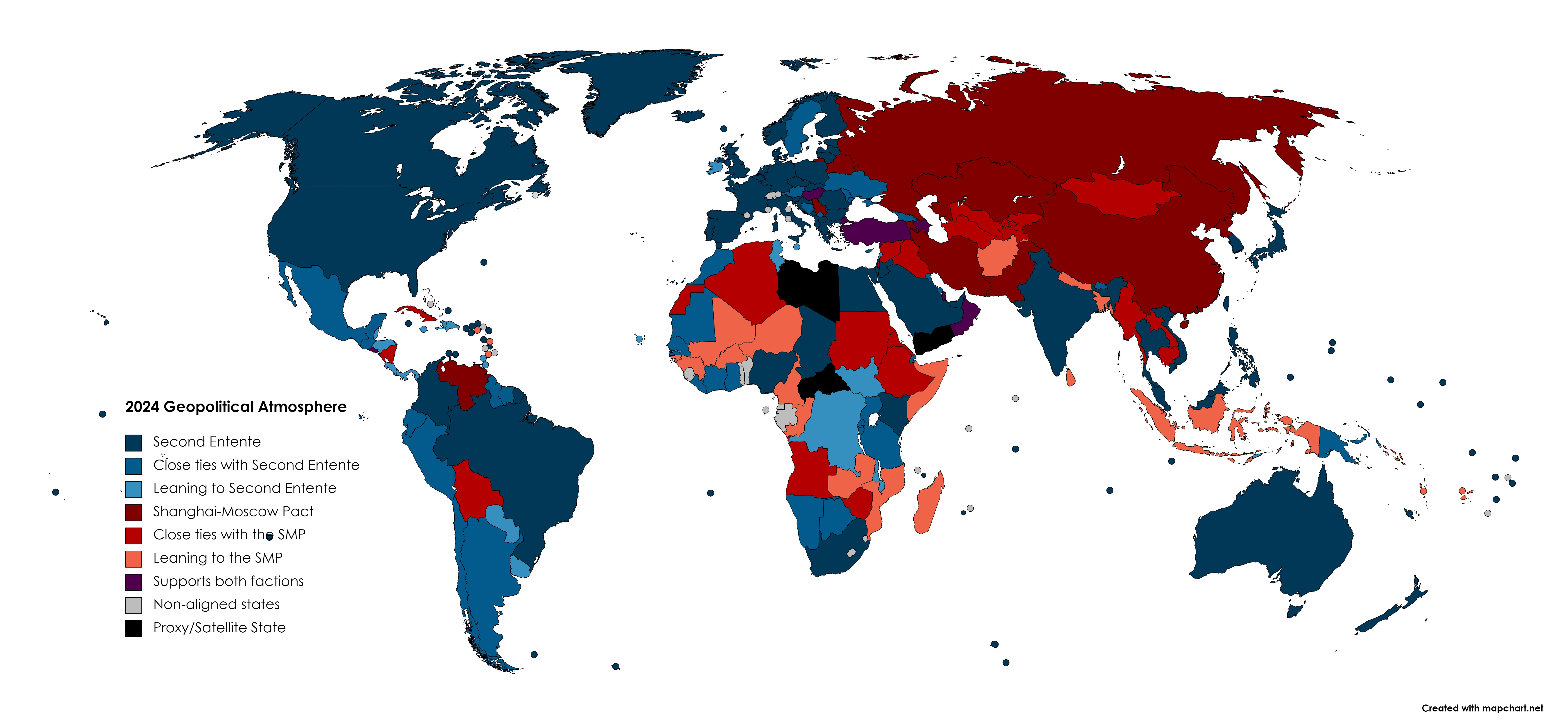 Even though both were neutral, Chad and Algeria began eying up the conflict as potential risks of intervention and escalation in the general Sahel region as Algeria was already engaged in a low-level Islamist conflict down south, and Chad walking a tightrope as it's neighbors, north, south, west and east begin are either embroiled in war or are preparing for such war, and it didn't help Chad as Niger was at war, tensions in Libya have turned into fighting, destabilization in the CAR was higher than ever, and that Sudan was suspiciously mobilizing for war. While Chad was a case of interest, the cracks began to form inside the Second Entente and the proxy in Libya became the main stage as the UAE, Saudi Arabia and Egypt battled against Turkey in indirect combat in Libya and both sides calling for the removal of the other. The US and EU displayed severe hesitance in such decisions. They feared that if Turkey were to be removed, they'd announce neutrality and fight only in Libya or even side with the SMP, with them unaware of Erdogan's collaboration with Putin and the SMP. If Egypt, Saudi Arabia and the UAE were removed, it would impact the flow of oil to the Entente, the Entente loses the Suez Canal and Red Sea, and even they all side with Russia and begin pressuring their crucial ally of Israel. Second Entente command was slow in responding to any of these decisions due to the potential reprisals that could come with any response. Following these rifts, the SMP would pay close attention to these cracks and even though Turkey was a link, they continued to try and find more cracks to seep into and exploit. Confusion would run rampant after the Spanish Navy would have a ship harassed during a patrol of the Mediterranean near the Libyan coastline, and while the perpetrator of the attack was still unknown, the incident caused further lobbying of SMP and Entente support for campaigns in Africa. Malta, would eventually join the war out of a security threat due to the escalation on the Libyan frontlines and would unofficially side with the Entente and support Tripoli's Government, as it had done in 2019.