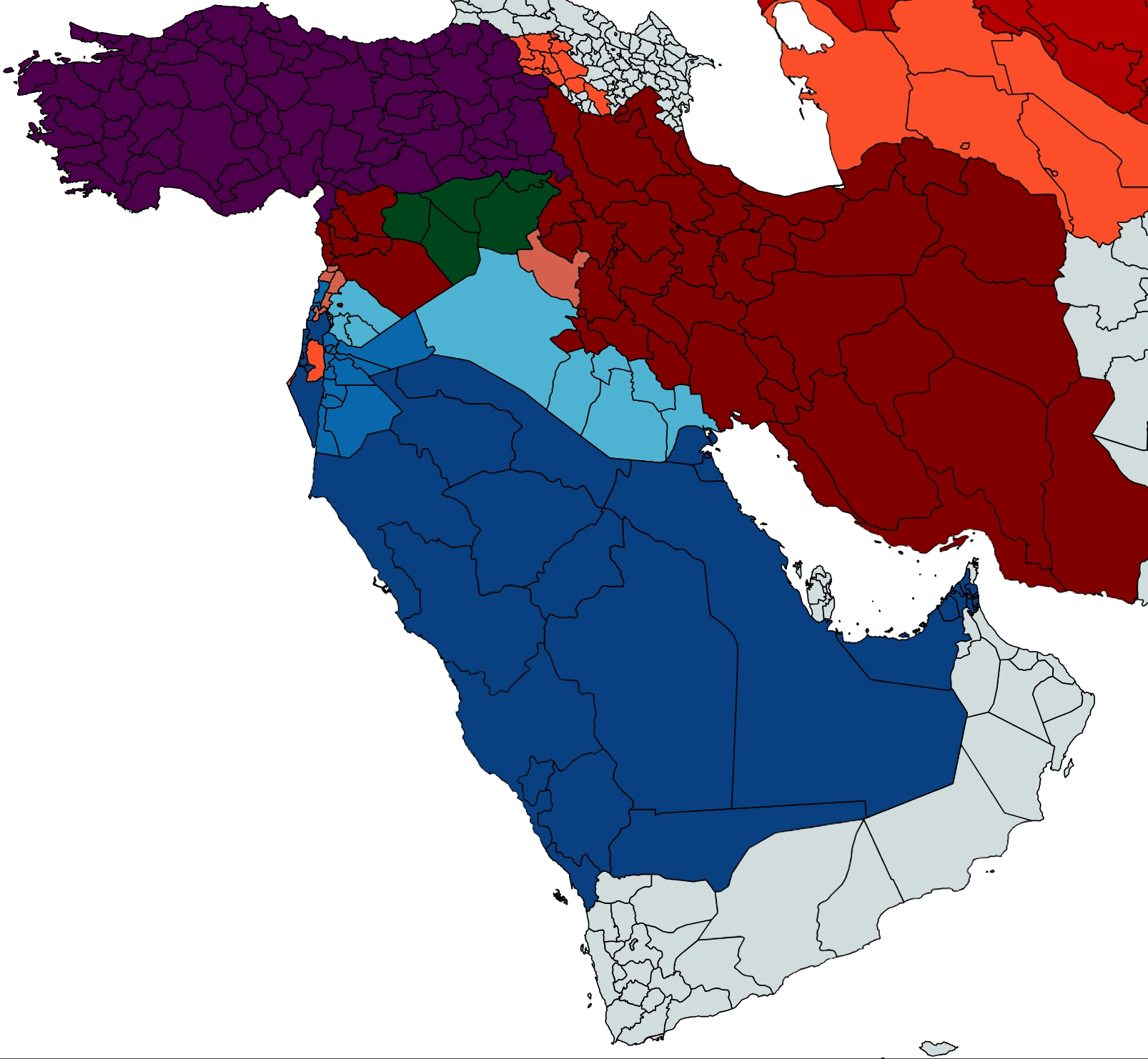 Middle East Front at the beginning of the war. c. 2025Green represents the Kurdish Peshmerga and Rojava.