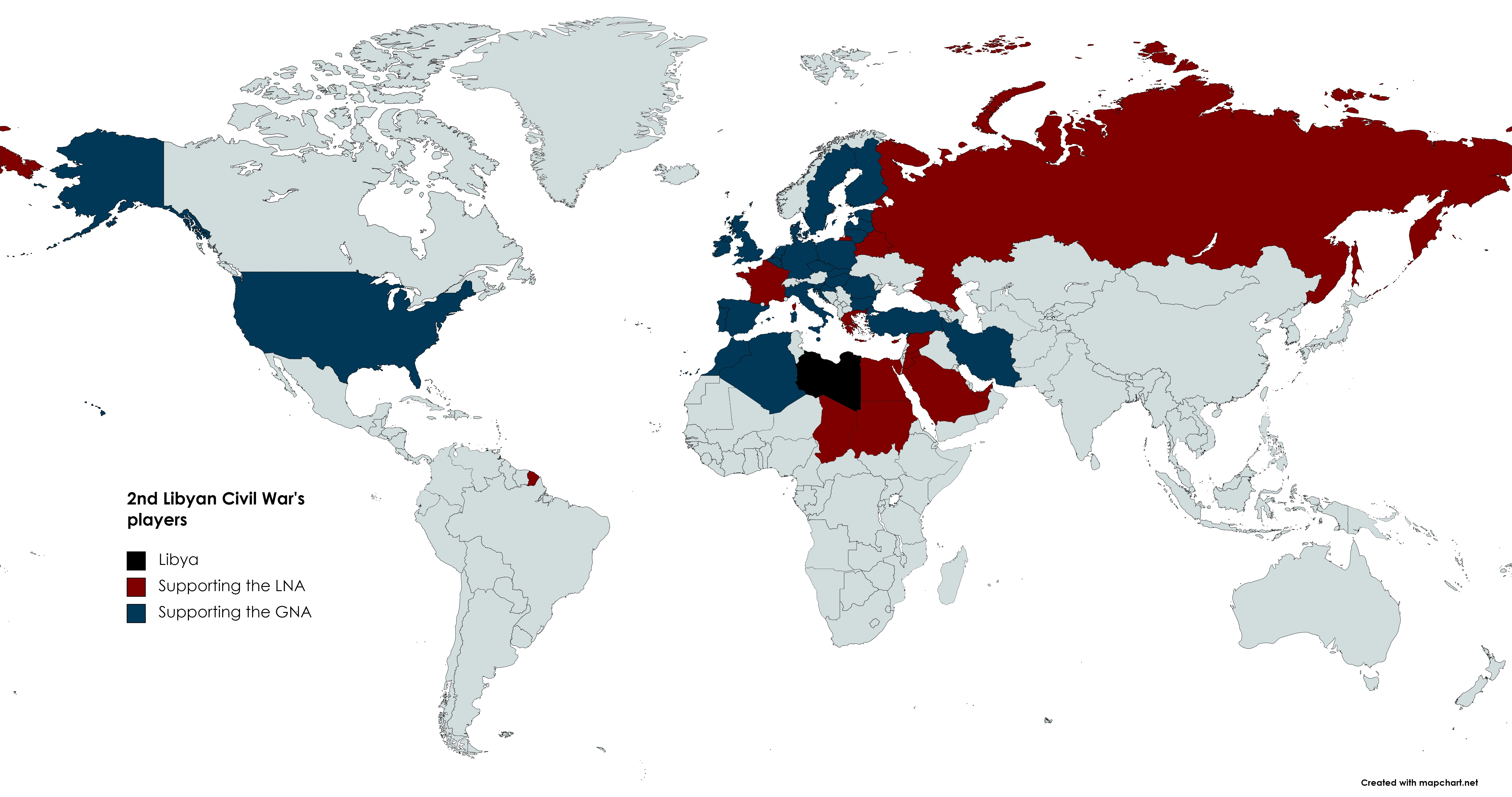 With severe escalation, neutral nations especially in Africa were being pressured to send resources to their cooperative partners and with both the Second Entente and SMP imposing blockades all over and with air and maritime traffic routes being disrupted had also managed to disrupt the trading of resources of all types, including the valuable resource of oil and gas, and both factions deemed it imperative to replace the losses. Even though there was combat present in both West and East Africa, it was only inevitable until the corrosive fighting spread elsewhere in Africa as tensions between the Tripoli and Tobruk governments began to heat up and after the dissolution of the UN, it was clear that the ceasefire was bound to fail. Countries that backed the UN government in Tripoli, mainly Italy, the UK, Turkey and much of the EU would encourage the Tripoli Government to launch new offensives and crush the imposter government in Tobruk. While behind the US' back, Saudi Arabia, Greece, Egypt and the UAE, and neutral countries like Chad and even SMP countries like Syria encouraged Haftar to take a stand against those in Tripoli to help secure oil supply for the war effort.