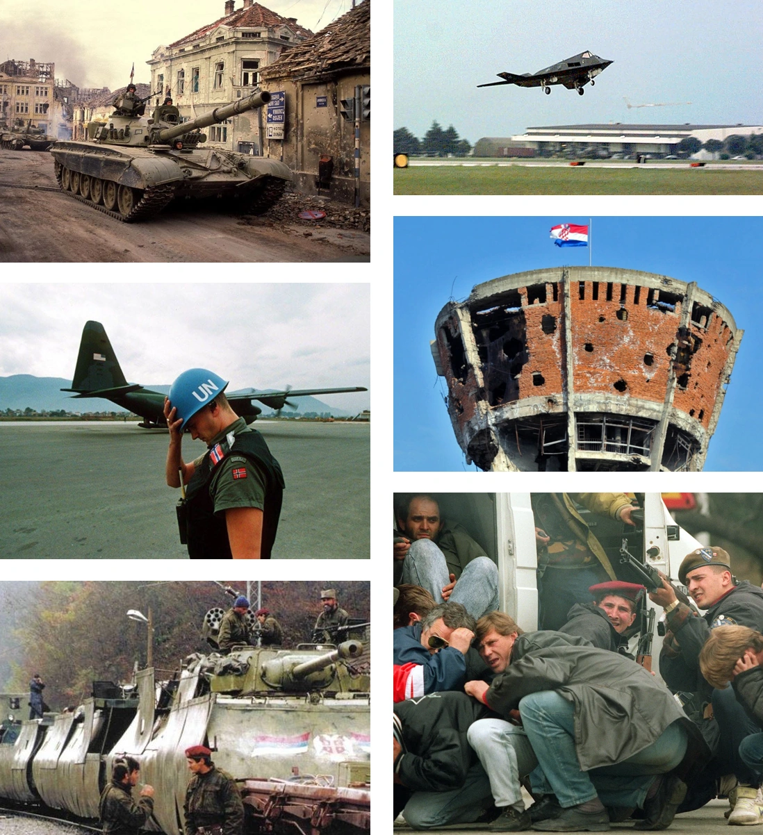 (From left to right) Yugoslavian M84 tanks in Vukovar during the Croatian War, F-117 Nighthawk taking off from Aviano Air Base, Norwegian peacekeeper during the Siege of Sarajevo, the Vukovar Water tower which was damaged during the war, the Krajina Express which was an armored train used by Krajina, Bosnian soldier attempting to protect civilians from sniper fire.